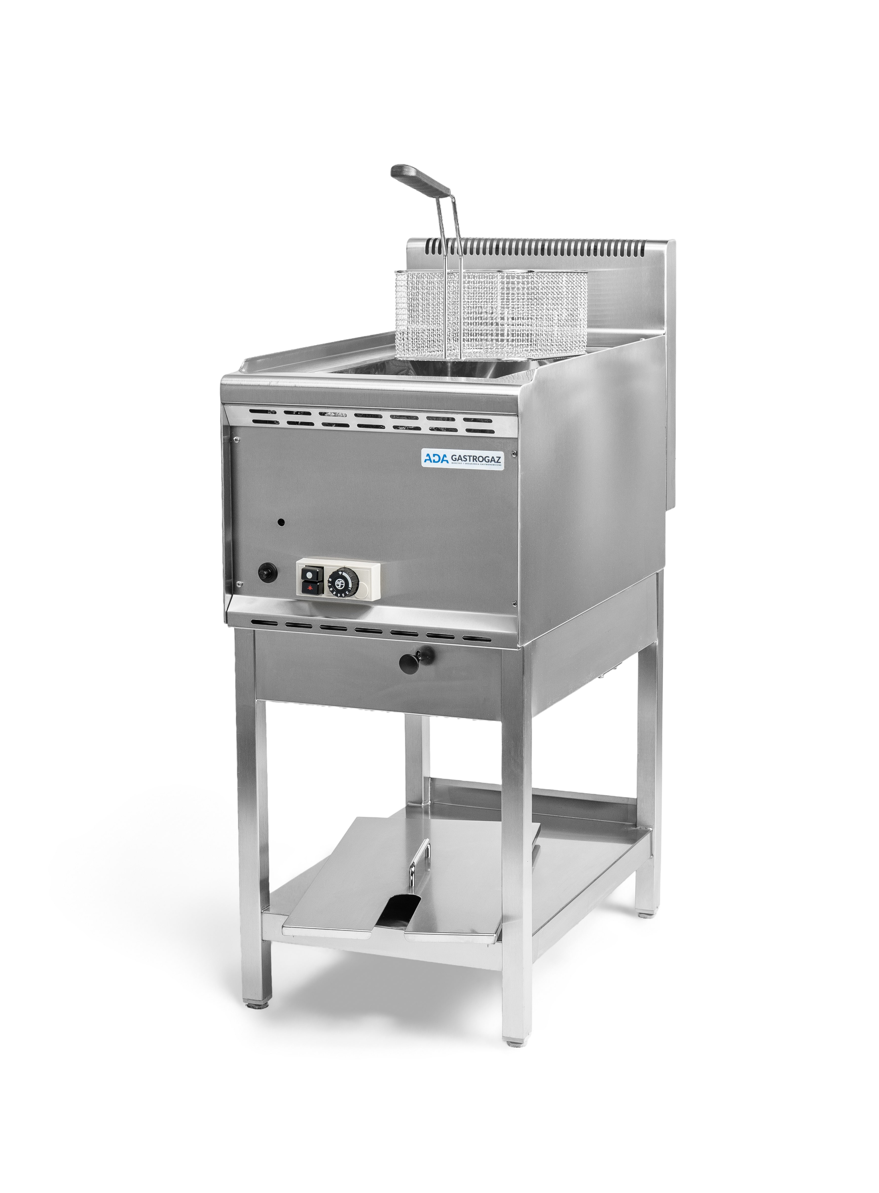 Die Ölfritteusen ADA FG 8 und FG 2×8 sind freistehende Gasfritteusen. Allerdings verwenden FG 15 und FG 2×15 einen Ständer (der im Lieferumfang des Geräts enthalten ist) mit verstellbaren Edelstahlbeinen. Die Gasfritteusen ADA FG 8, FG 2×8 und FG 11R (zum Braten von Fisch) müssen auf einem Ständer oder einer Arbeitsplatte mit einem Loch aufgestellt werden, um eine ausreichende Luftzirkulation zum Gerät zu gewährleisten. Dies liegt daran, dass die direkte Erhitzung des Öls von unten erfolgt. Darüber hinaus befindet sich das Ölablassventil an der Unterseite des Geräts.