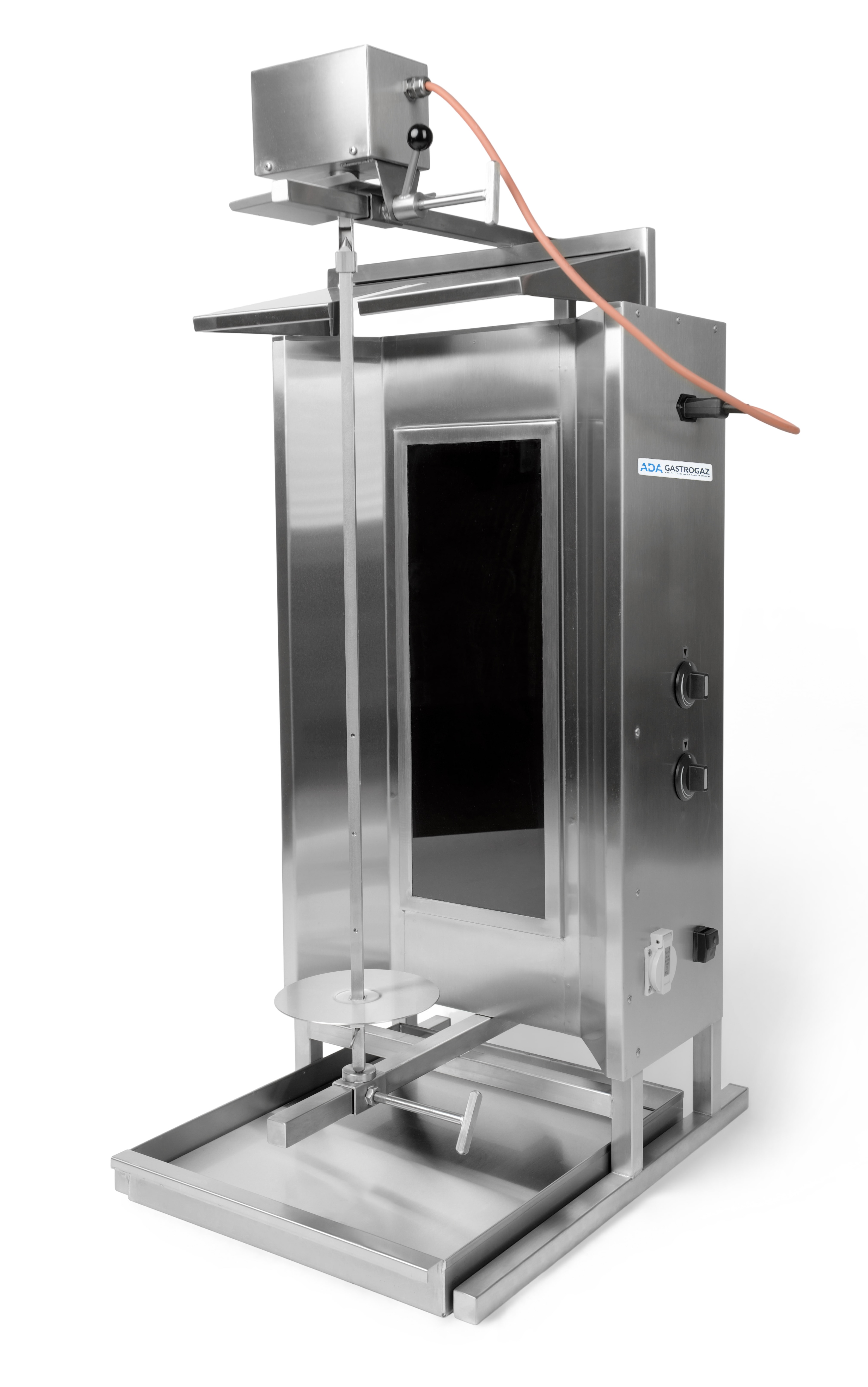 Opiekacze elektryczne do kebaba, gyrosa ADA OE są urządzeniami przeznaczonymi do opiekania mięs umieszczonych na pionowym widelcu. Produkowane przez nas opiekacze zbudowane są z wysokogatunkowej stali nierdzewnej kwasoodpornej. Częścią napędową opiekaczy jest elektryczny motoreduktor umieszczony na prowadnicy w górnej części opiekacza.