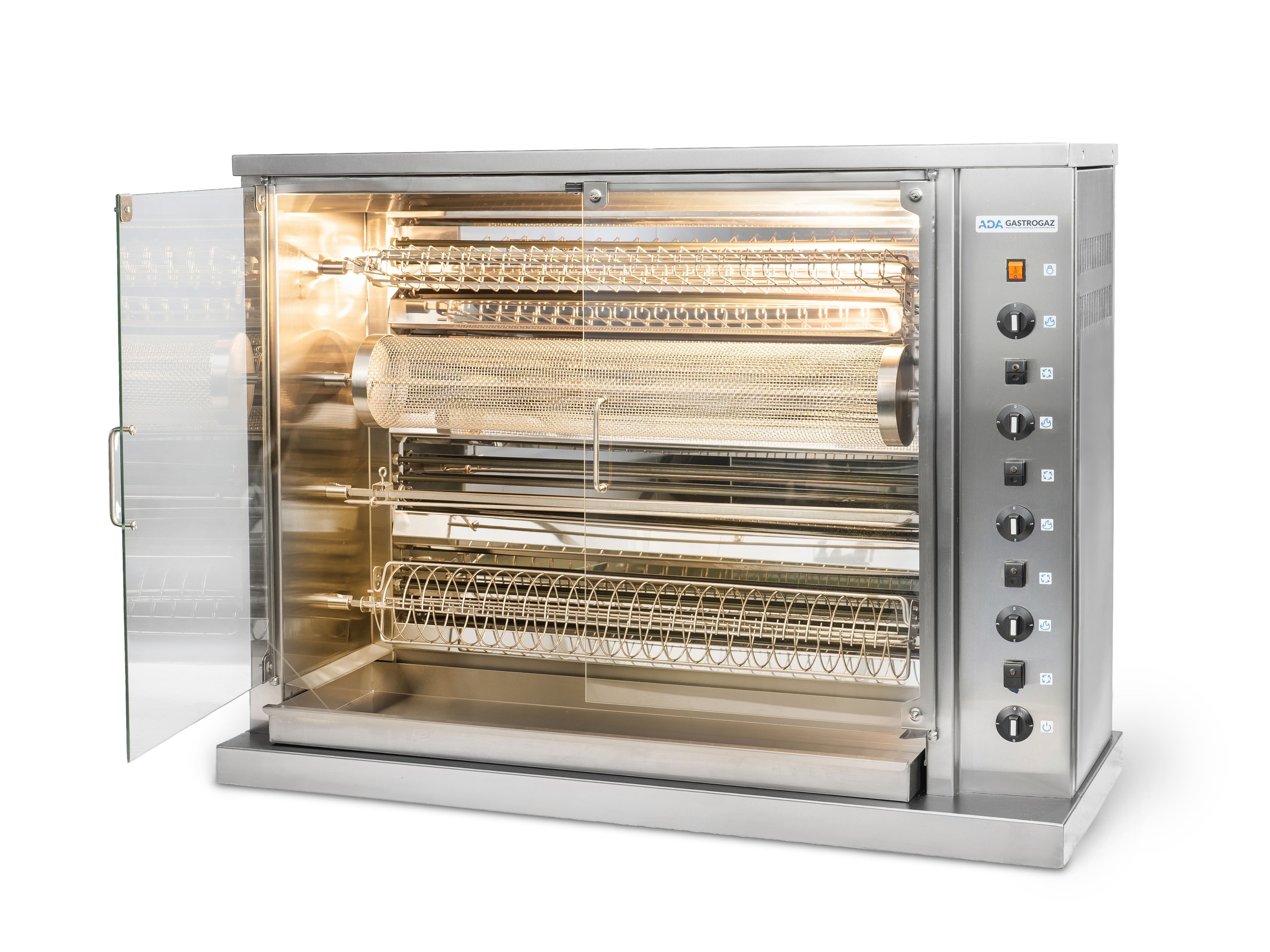 Obrotowe rożna elektryczne ADA E są starannie wykonane ze stali nierdzewnej kwasoodpornej gat. AISI 304 oraz niezawodnych, wysokojakościowych podzespołów. Rożna ADA E  wyposażone są w jeden rząd obrotowych widelców, z których każdy posiada dedykowany mu silnik. Za proces opiekania odpowiadają grzałki elektryczne zlokalizowane na tylnej ścianie urządzenia, których moc kontroluje się za pomocą ergonomicznych pokręteł. Drzwi ze szkła hartowanego gwarantują zachowanie odpowiedniej temperatury wewnątrz komory grzewczej, a ponadto zapewniają bezpieczeństwo użytkowania urządzenia.